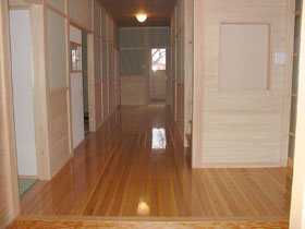 平成17年3月に完成。木造2階建60坪 設計・施工を行いました。 外観:周囲の景観にあった和風の趣 玄関より:真壁の落ち着いた雰囲気の1階。ゆったりと幅をとった廊下が奥まで続く 2階:大壁の腰壁は1階とは違う材質を使用し、明るい雰囲気に。 新築