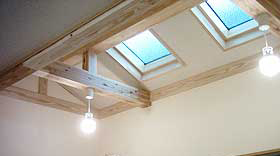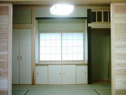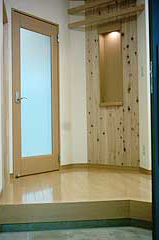 平成18年7月に完成。木造2階建 設計・施工を行いました。 外観:外壁材とポーチ部分で家の「顔」に表情を与える 内観:玄関ホールはドアと飾り棚に角度をつけてアクセントにする 内観:出窓の外は隣家 天窓から採光を補う 内観:和室 新築